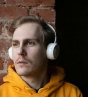A showroom displaying various wooden flooring samples mounted on walls. A person is observing the samples on the right side, wearing casual attire. The samples are labeled with prices and descriptions. The room is well-lit with a modern design and uses neutral tones.